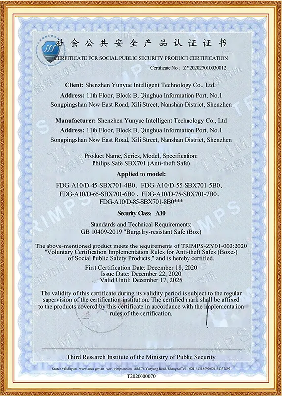 Fire Resistance and Burglary Resistance: Our smart safe provide UL-certified fire resistance and are compliant with China's CSP burglary-resistant standards. This ensures the utmost security for your valuable belongings, whether facing a fire or theft.